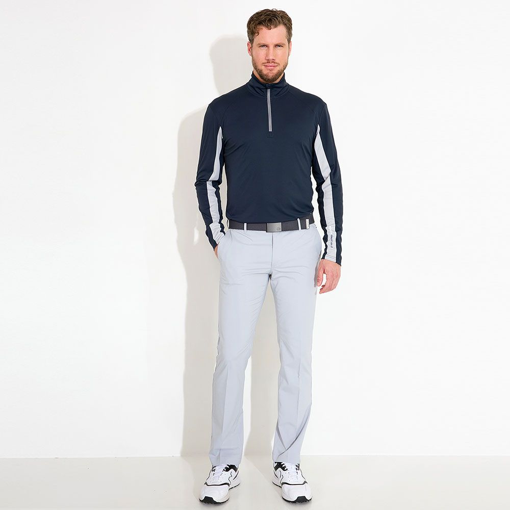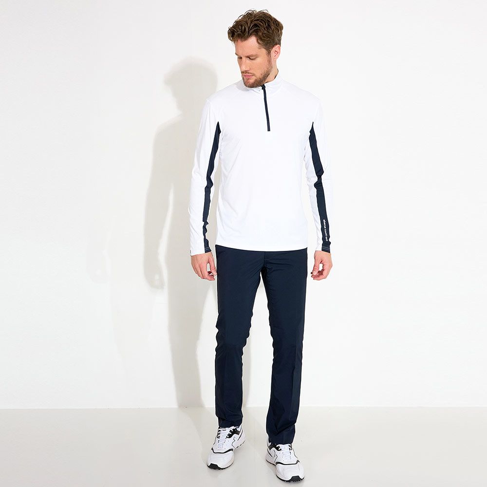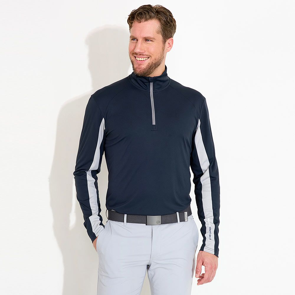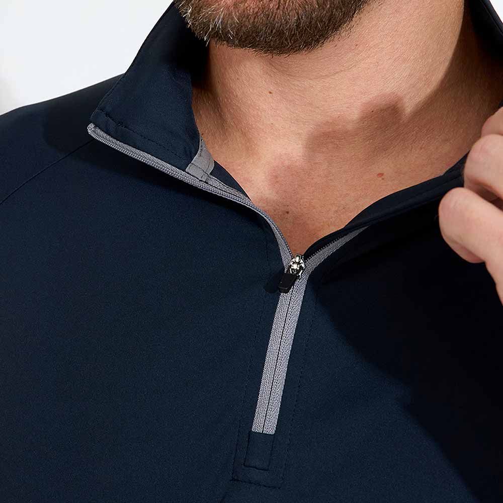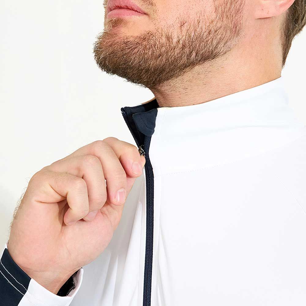 Designen inkluderar en dragkedja i halsen, polokrage, kontrastband längs ärmen och över ryggen. Abacus-logotypen pryder vänster ärm och nacken. Perfekt som ett extra lager under din piké eller att bära enskilt för ett smidigt UV-skydd ute på golfbanan.
