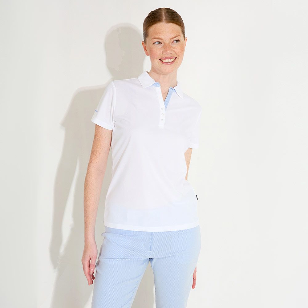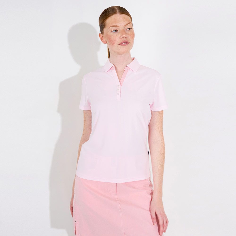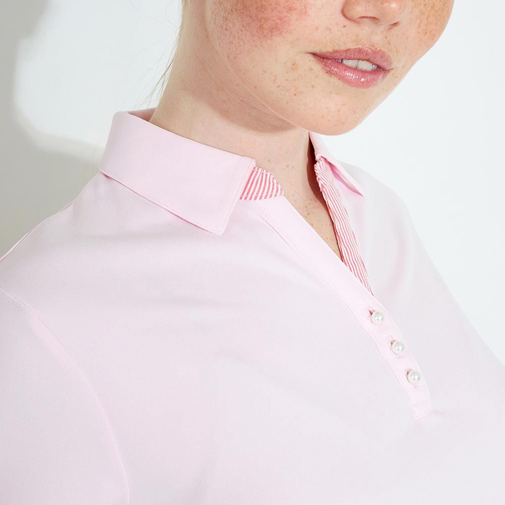 Bovey är en stilren och bekväm pikétröja med kort ärm och en feminin touch. Tillverkad av mjuk och stretchig återvunnen polyester, erbjuder den en skön passform med DryCool- och fukttransporterande funktioner som håller dig torr och bekväm hela dagen. Designen är klassisk med en skuren och sydd krage, en knappslå med tre pärlemorknappar och en elegant randig kontrast på insidan av V-ringningen. Perfekt både på golfbanan och till vardags.