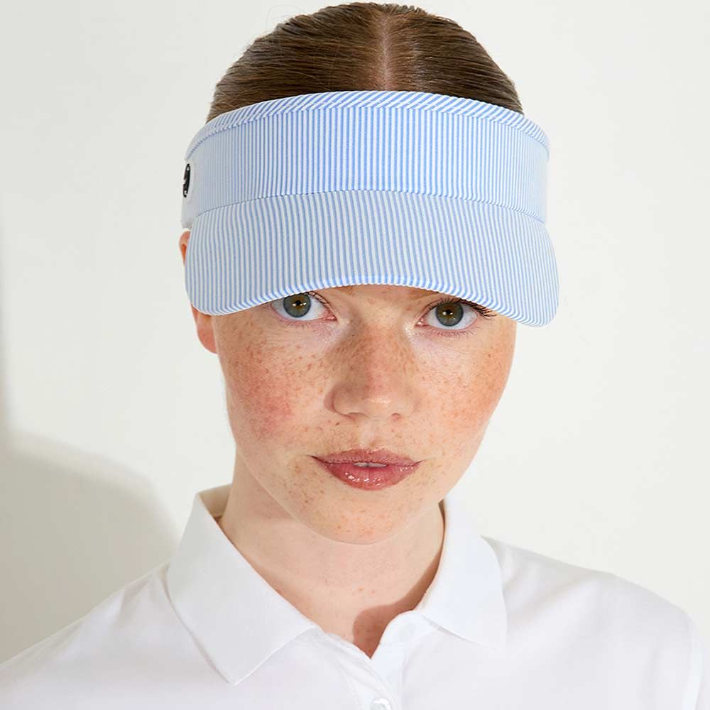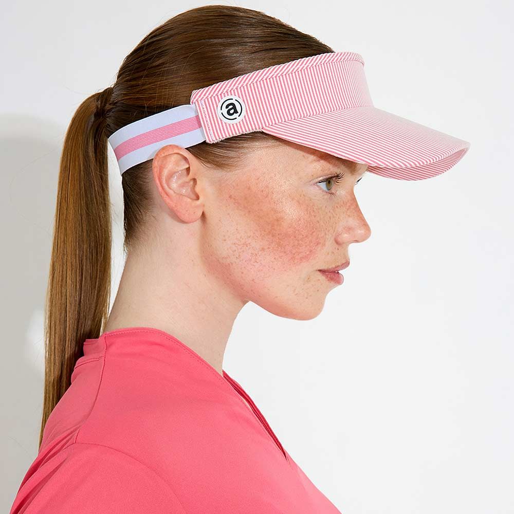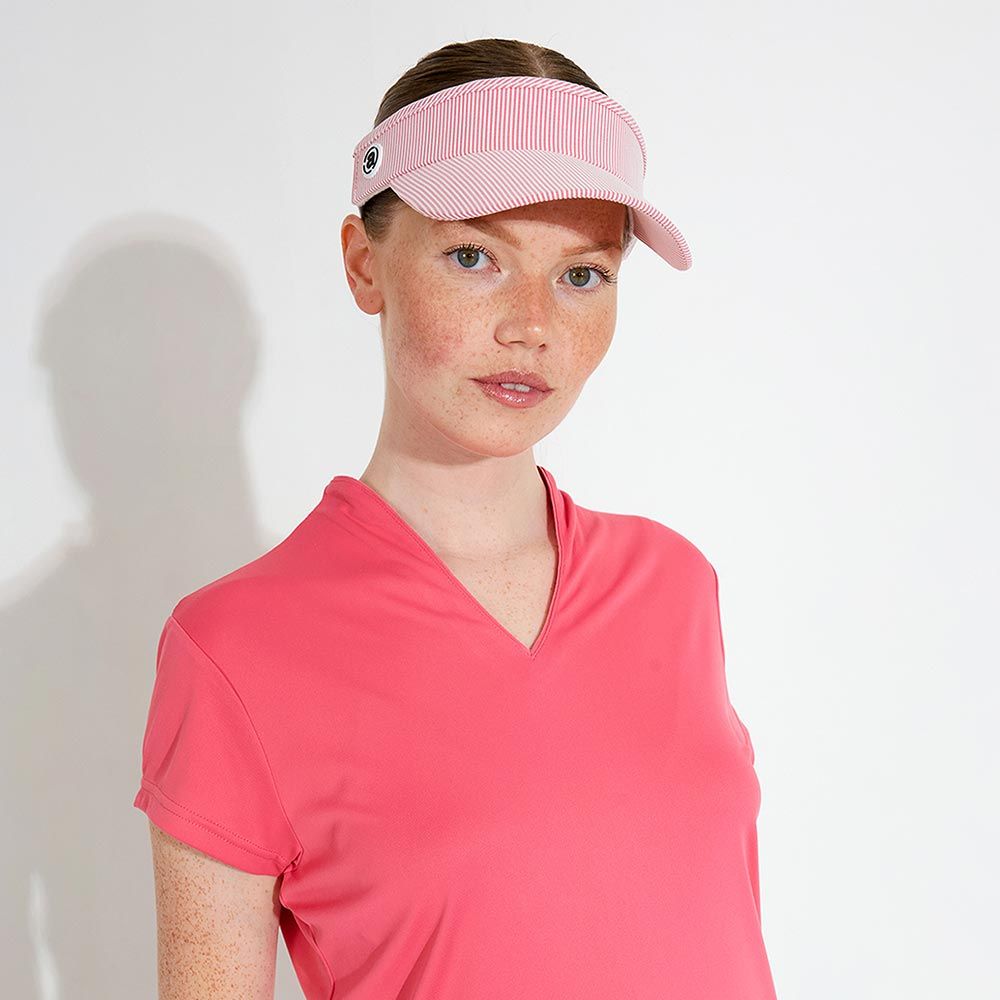 Bovey Visor är en snygg och funktionell solskärm med en feminin touch. Den har en rosa och vit färgkombination och ett elastiskt band med kontrastränder baktill för en flexibel och bekväm passform. Perfekt för soliga dagar på golfbanan eller andra utomhusaktiviteter.