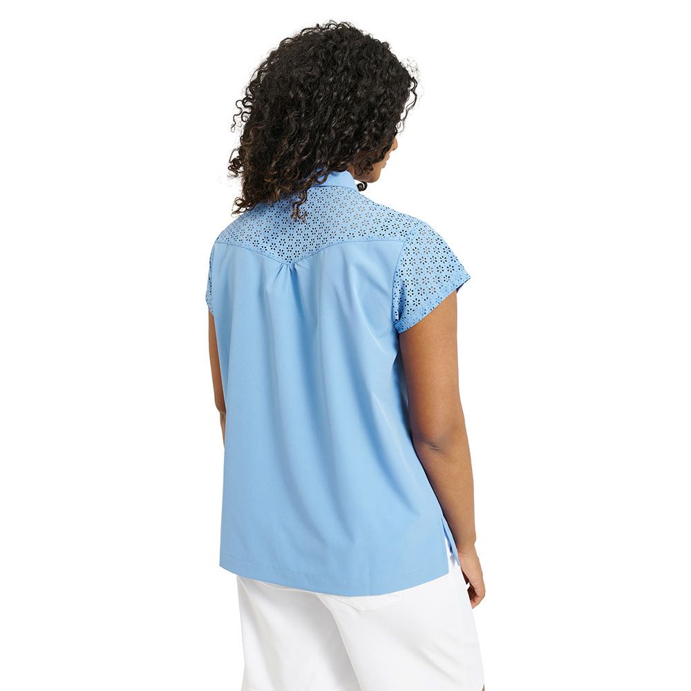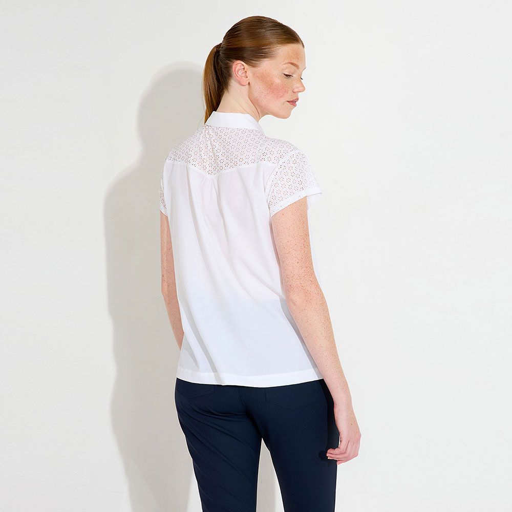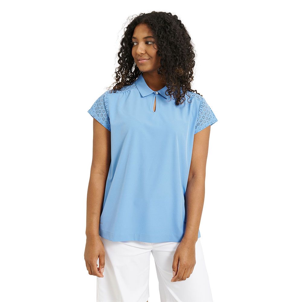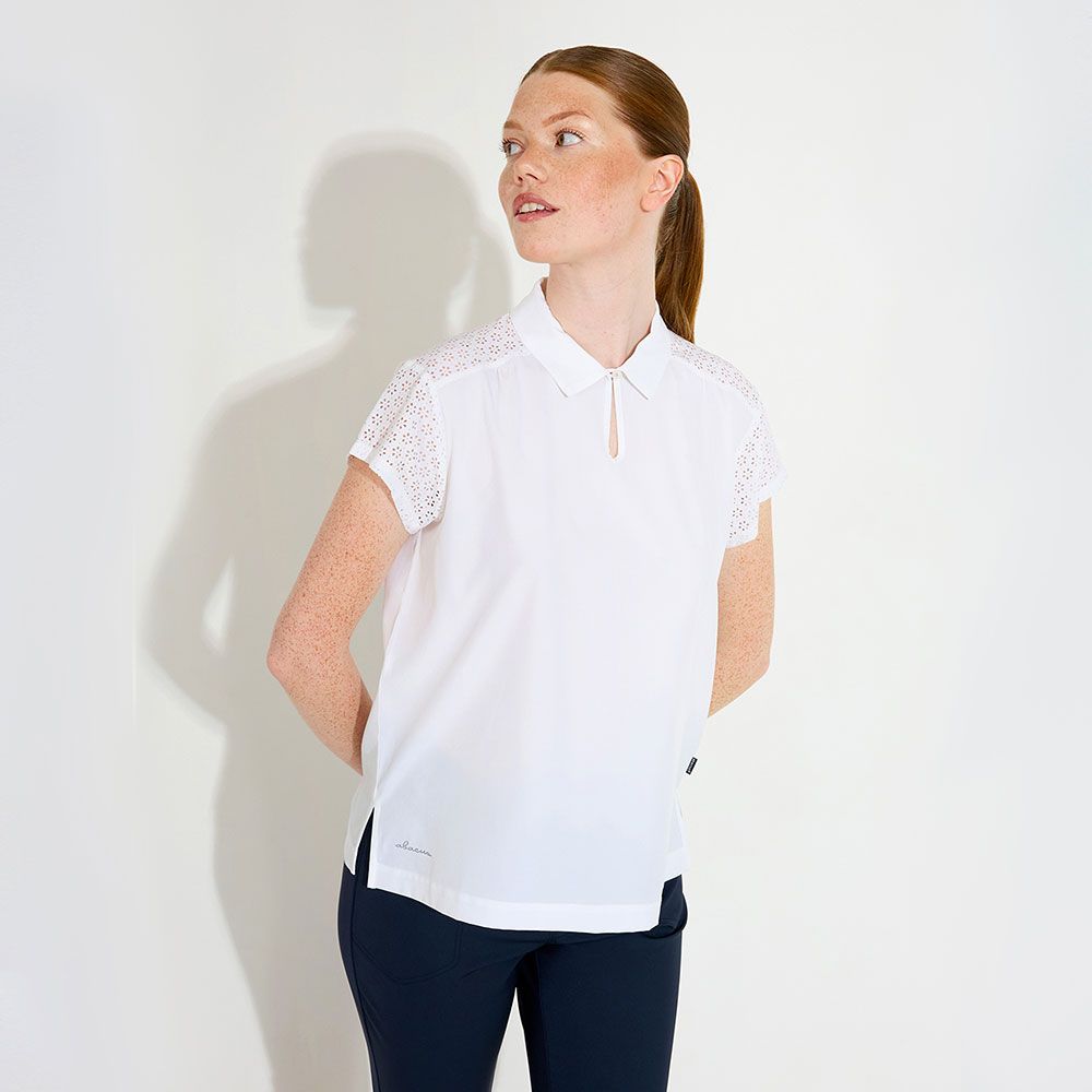 Manga Cupsleeve är en luftig topp med lös passform, perfekt för vår- och sommardagar på golfbanan eller som en stilfull del av din vardagsgarderob. De dekorativa hålade blommönstren på ärmarna och ryggen ger en feminin och elegant touch. Det lätta och bekväma materialet gör den idealisk för varma dagar. En mångsidig topp som kombinerar stil och funktion!