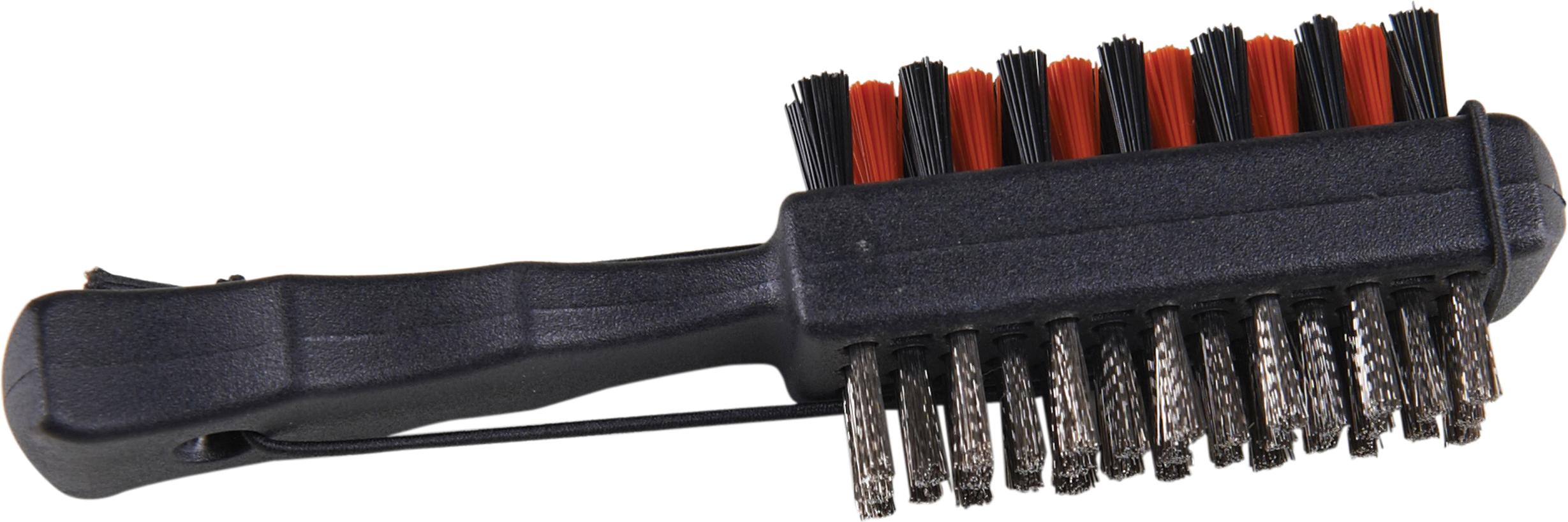 På ena sidan finns en mjuk nylonborste för lera och gräs, på andra sidan en borste av mässing för mer envis smuts djupt nere i skårorna.