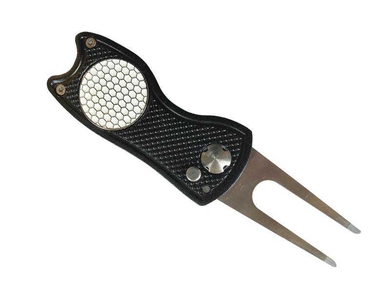 Taggarna fäller du ut med ett enkelt knapptryck. Kan användas runt green som ställ för att hålla uppe din extraklubba. Grundfunktionen är dock fortfarande att den ska användas för att laga nedslagsmärken.