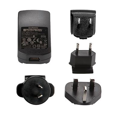 Ladda din enhet vart du än reser med Garmins nätadapter. Tryck i adaptern i ett vägguttag och anslut den till din enhet med en USB-kabel (ingår ej). Innehåller internationella adaptrar för USA, Storbritannien, Europa och Australien.