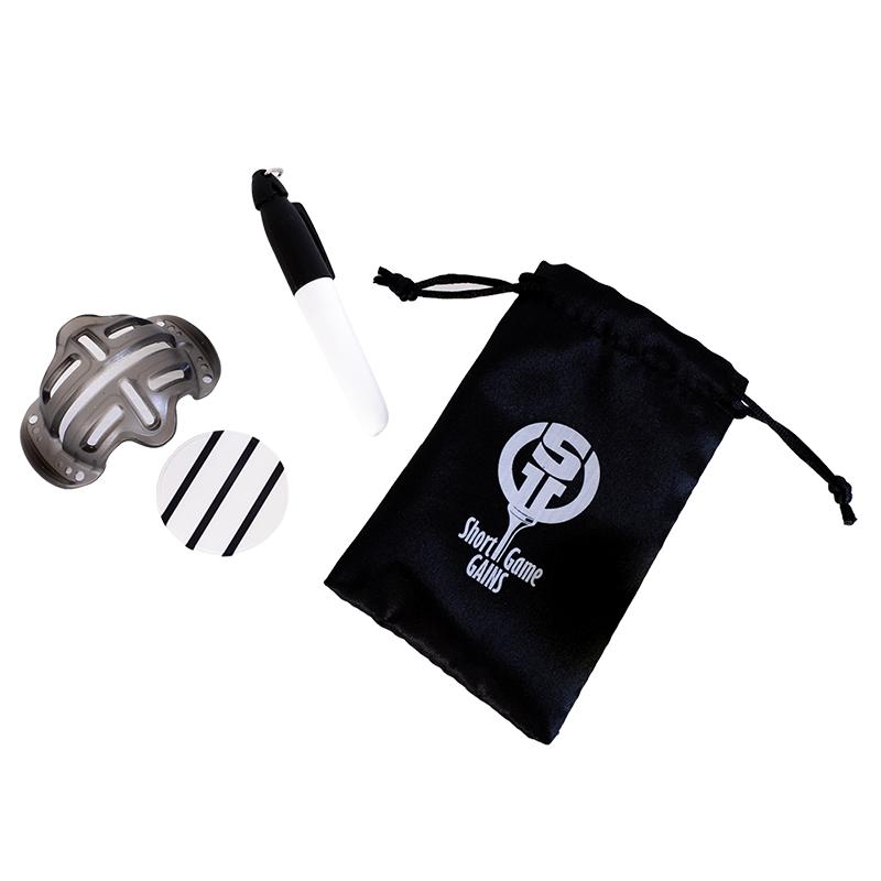 Short Game Gains Accurate Aim Kit hjälper dig att sikta mer exakt genom att du använder en markeringsplatta bakom bollen där linjen förlängs och det blir lättare att linjera upp bollen så den pekar mot målet.