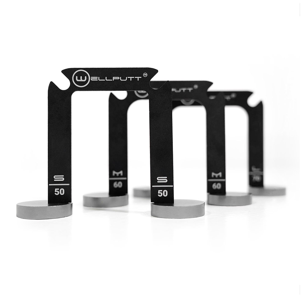 Förbättra din puttprecision med WellGate – ett set av tre puttportar i olika storlekar (50 mm, 60 mm, 70 mm). Perfekt för träning både hemma och på banan.